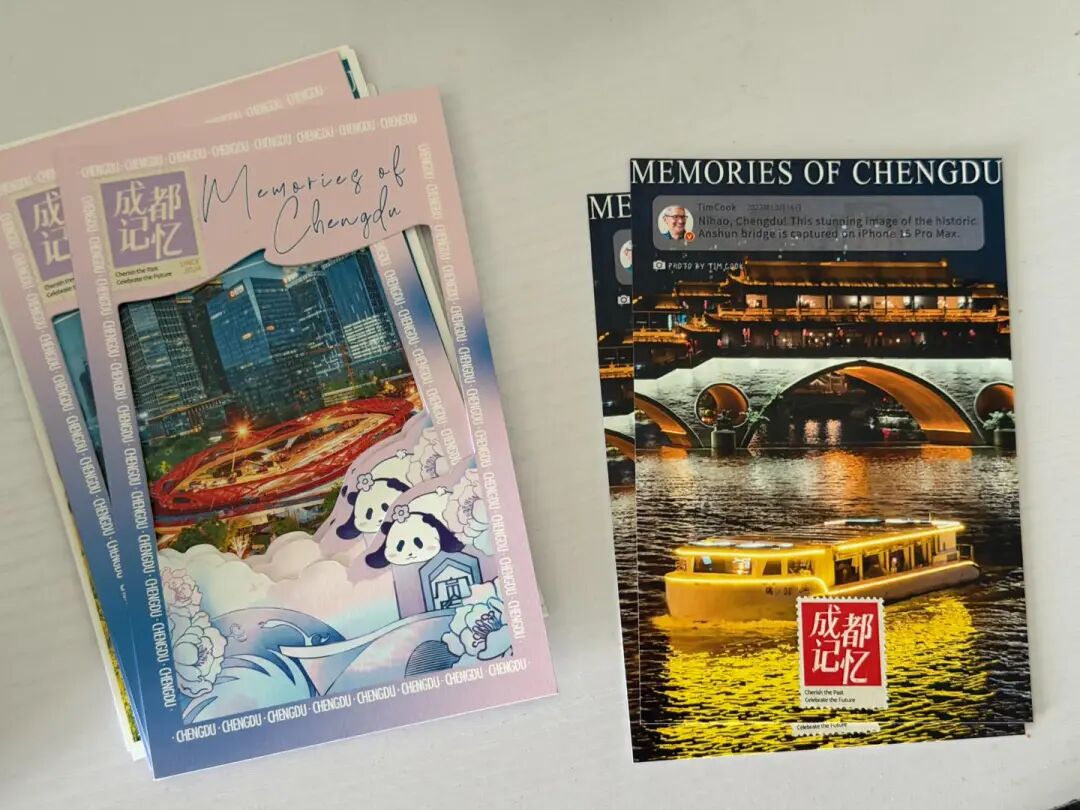 今日,在苹果50周年系列庆祝活动成都站上,红星新闻记者也为库克送上了一份礼物:根据2023年库克发布的成都安顺廊桥的照片制作而成的一张明信片,这是一份独属于库克的“成都记忆”。