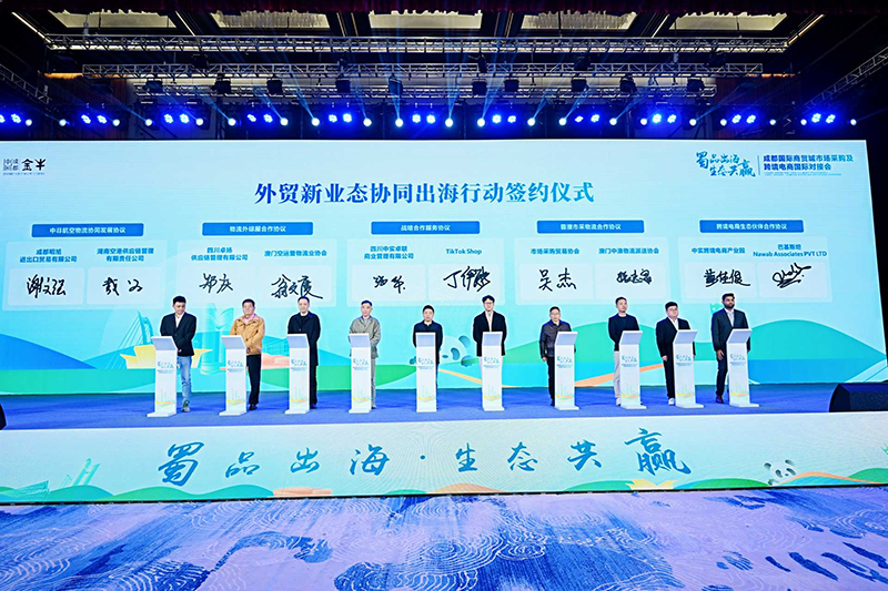 在签约环节,金牛区商务局与重庆市大足区商务委员会签署双城联动合作协议,金牛区市场采购贸易服务中心与德阳、眉山、资阳、内江、广元等商务部门签署市场采购贸易区域合作协议,共同推动成渝地区双城经济圈产贸融合协同发展。会上,“买全球,卖全球”川渝外贸新业态产贸融合协同出海行动正式启动,标志着以人才互联助推区域互动、产贸互通迈入发展新阶段。